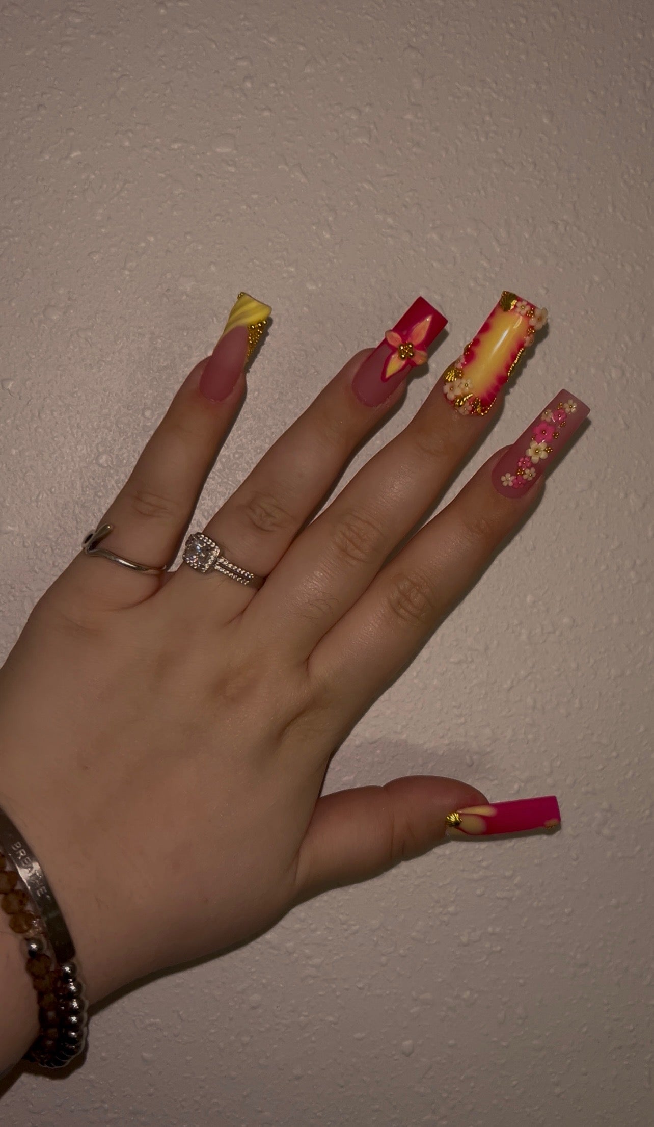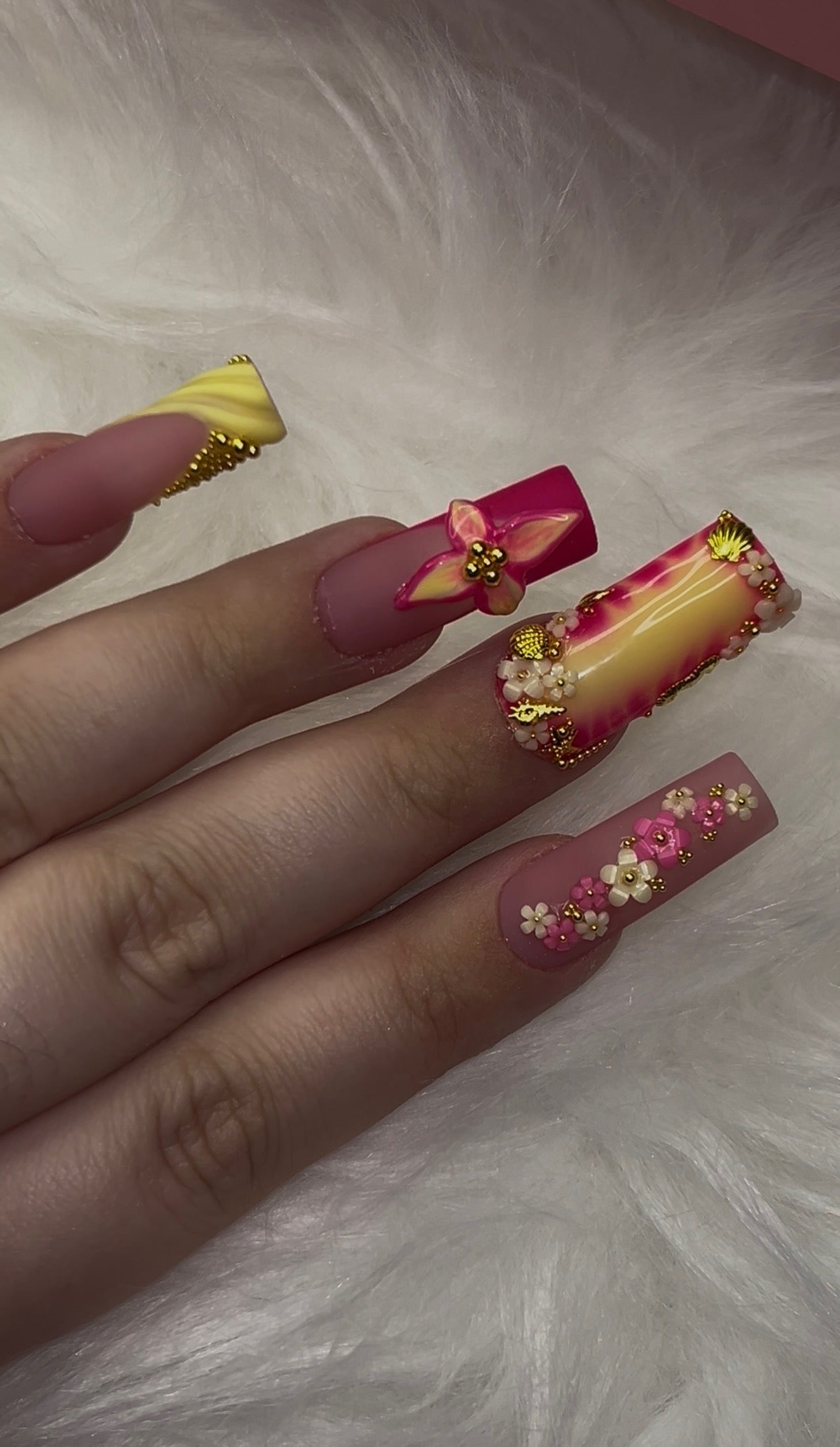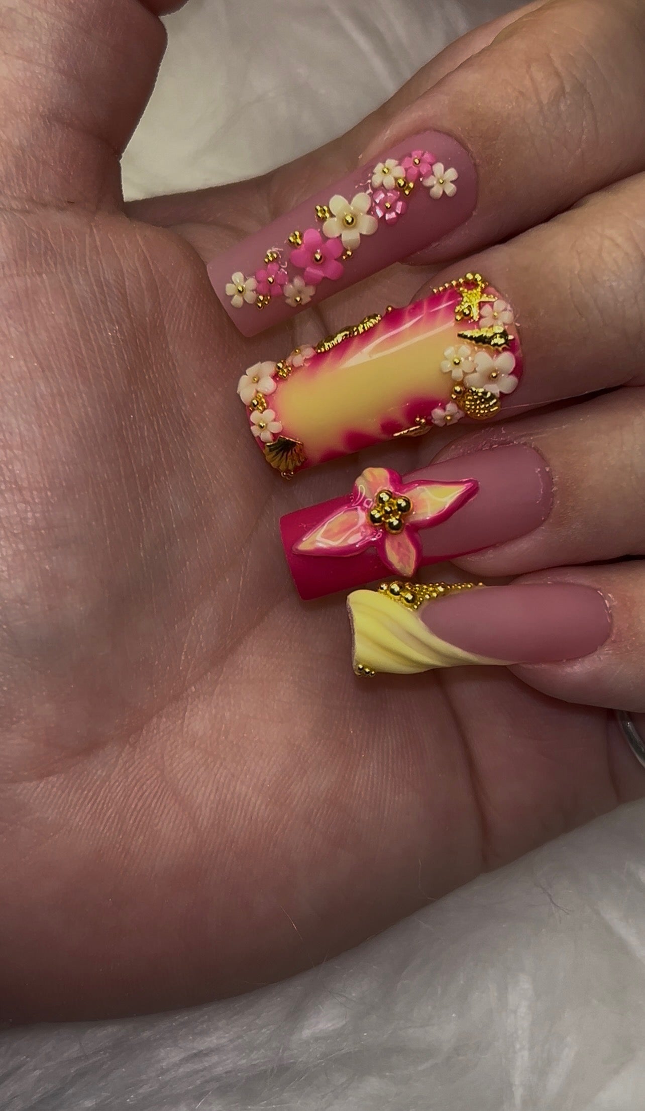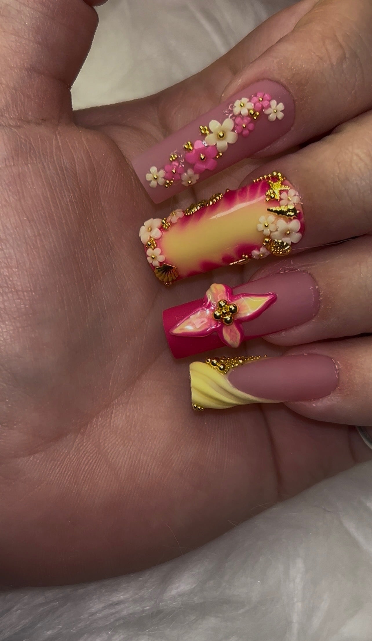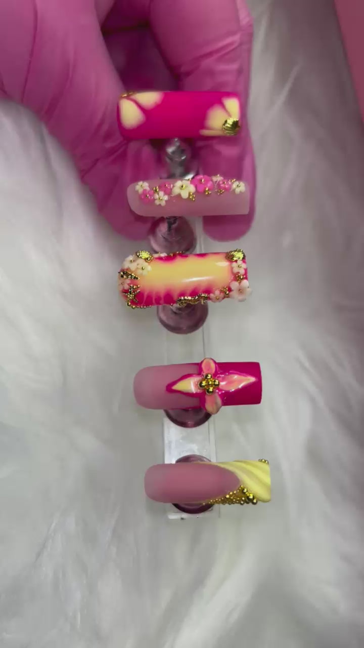 🌸 Thumb: A hot pink base with cascading 3D flowers and shimmering gold seashell accents—like a sunset bouquet kissed by the sea.