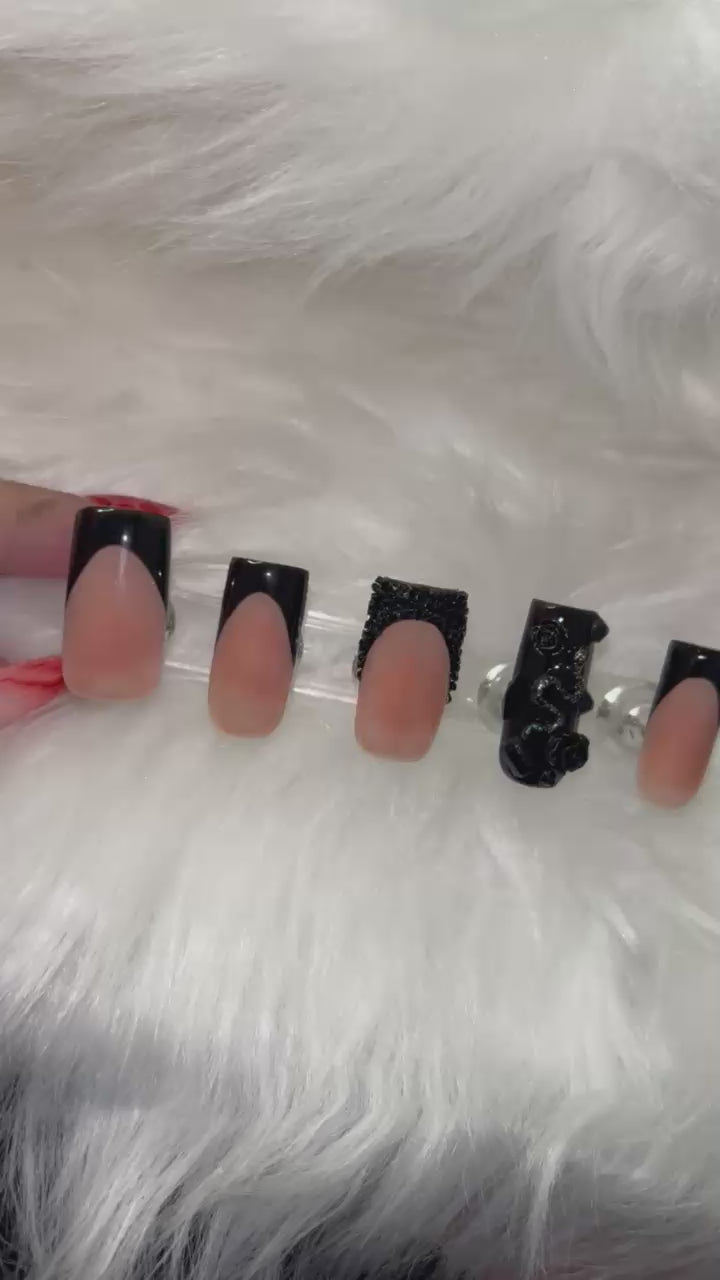 Dare to embrace the unknown with Grant Me Mystery, a stunning press-on nail set that exudes dark romance and sophistication. With sleek black French tips, textured 3D roses, and shimmering black accents, this set is perfect for those who love a touch of mystique and elegance in their look.