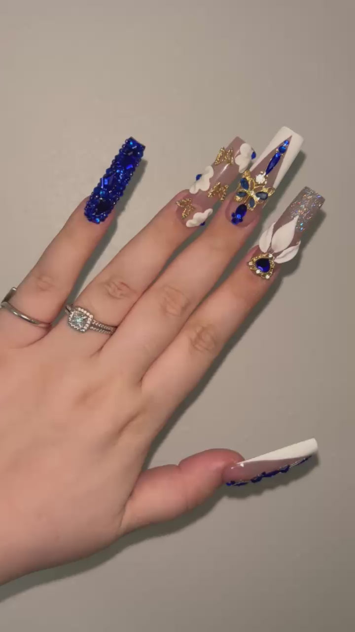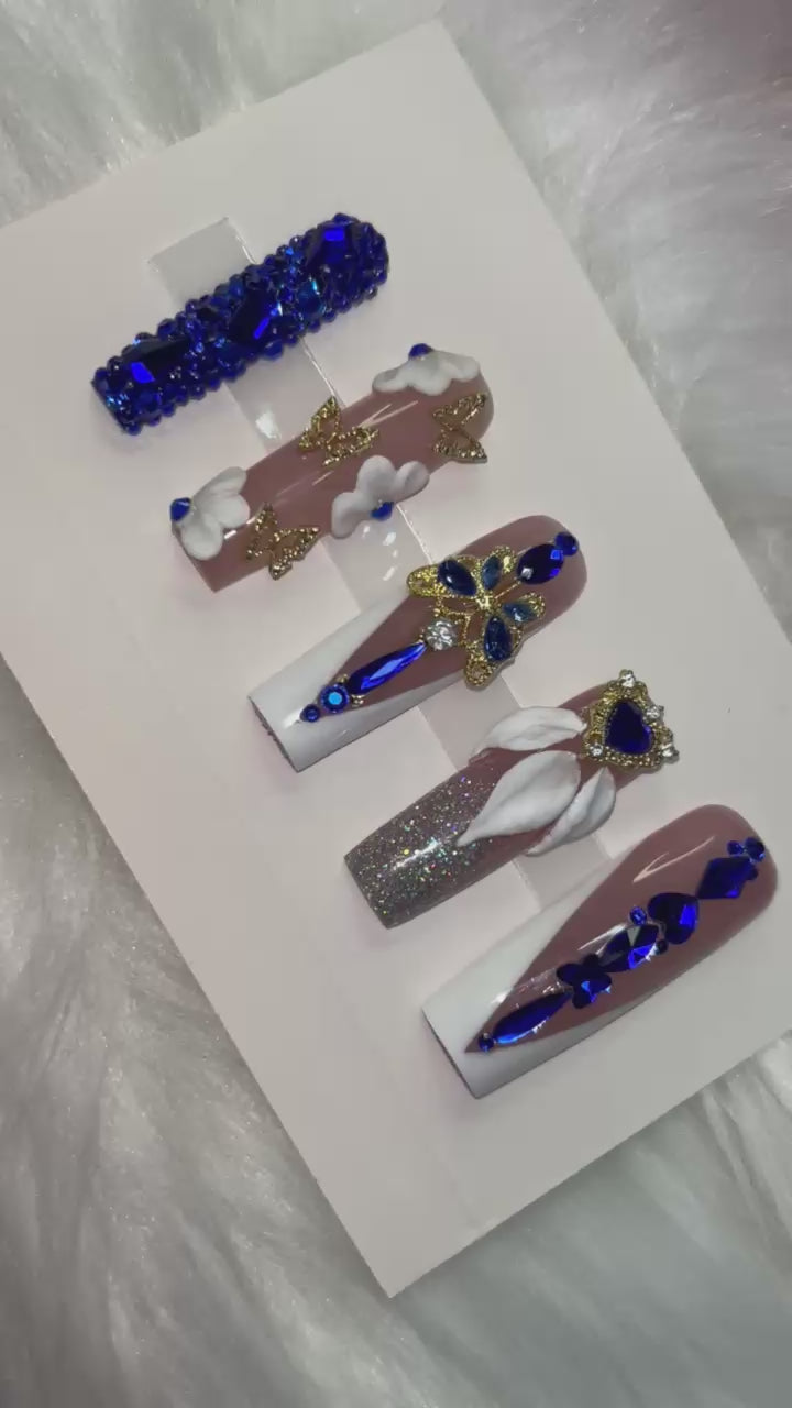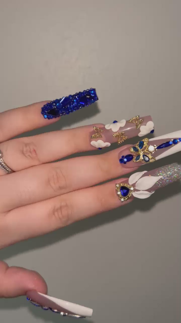 Sheβs dreamy, sheβs angelic, and sheβs serving MAJOR goddess energy πΌπ« Hailee Baby is a soft glam fantasy with deep sapphire gems π, gold butterflies π¦, 3D clouds βοΈ, and delicate sculpted wings β all tied together with glitter and shine for that show-stopping look β¨