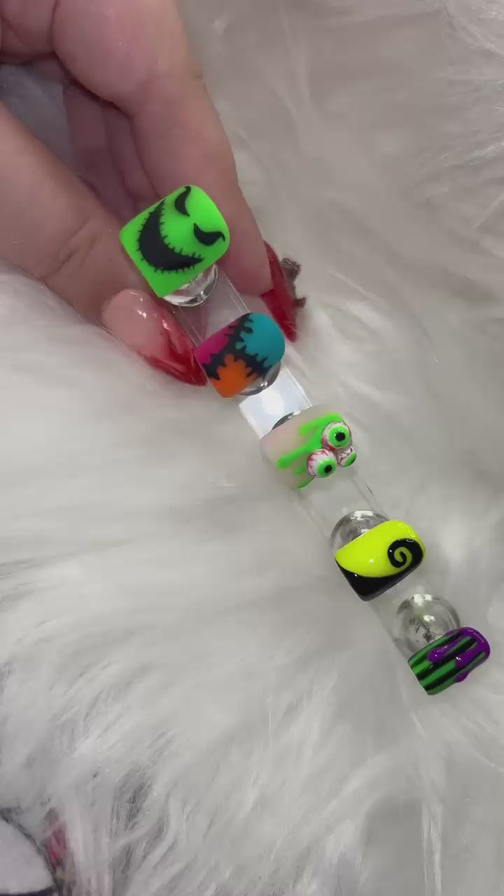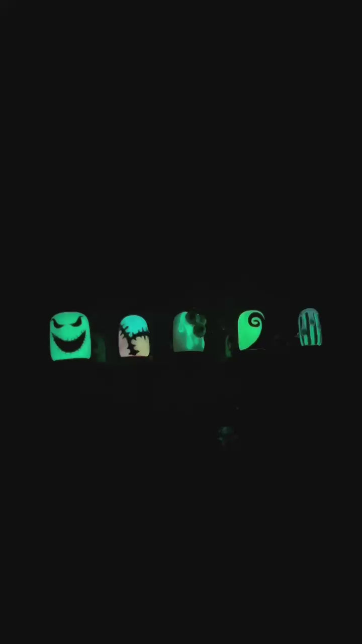 Get ready to turn heads with these spooktacular glow-in-the-dark nails! 💚🖤 Inspired by The Nightmare Before Christmas and Beetlejuice, this set is perfect for anyone who loves a hauntingly fun aesthetic! Featuring Oogie Boogie’s creepy grin, Sally’s stitched-up patchwork, and Beetlejuice’s signature stripes, these nails are a must-have for Halloween lovers, gothic glam fans, and those who embrace spooky vibes year-round! 🌙✨