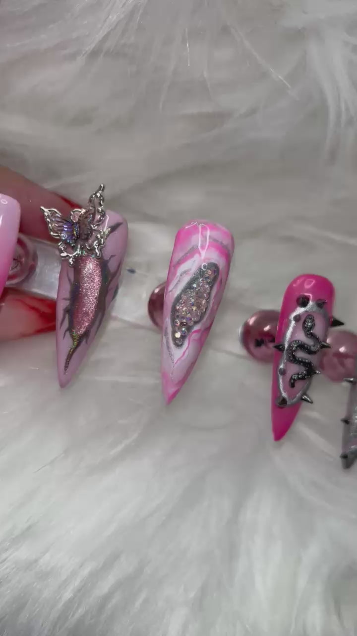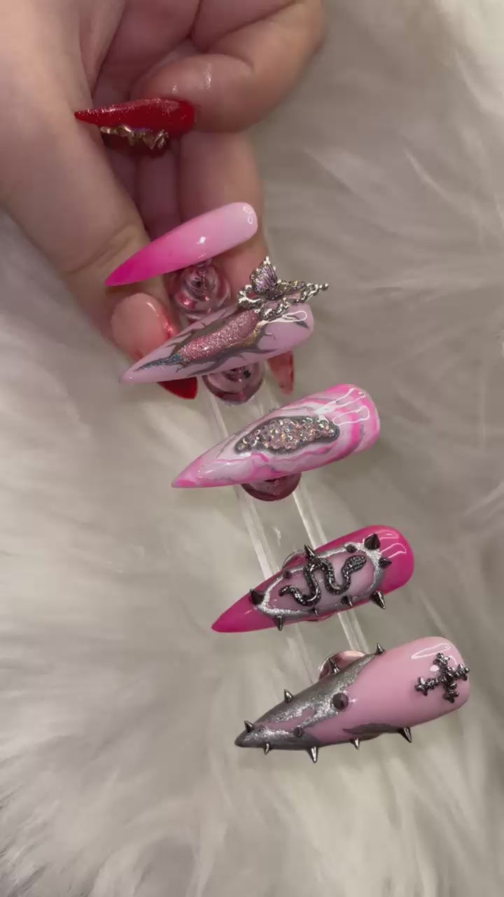 A perfect blend of sweetness and danger, Pink Ransom is for the ones who like their pretty with a sharp edge. 💘✨ Featuring a mix of soft pinks, striking metallics, and bold embellishments, this set captures the essence of a ransom note—demanding attention, impossible to ignore.