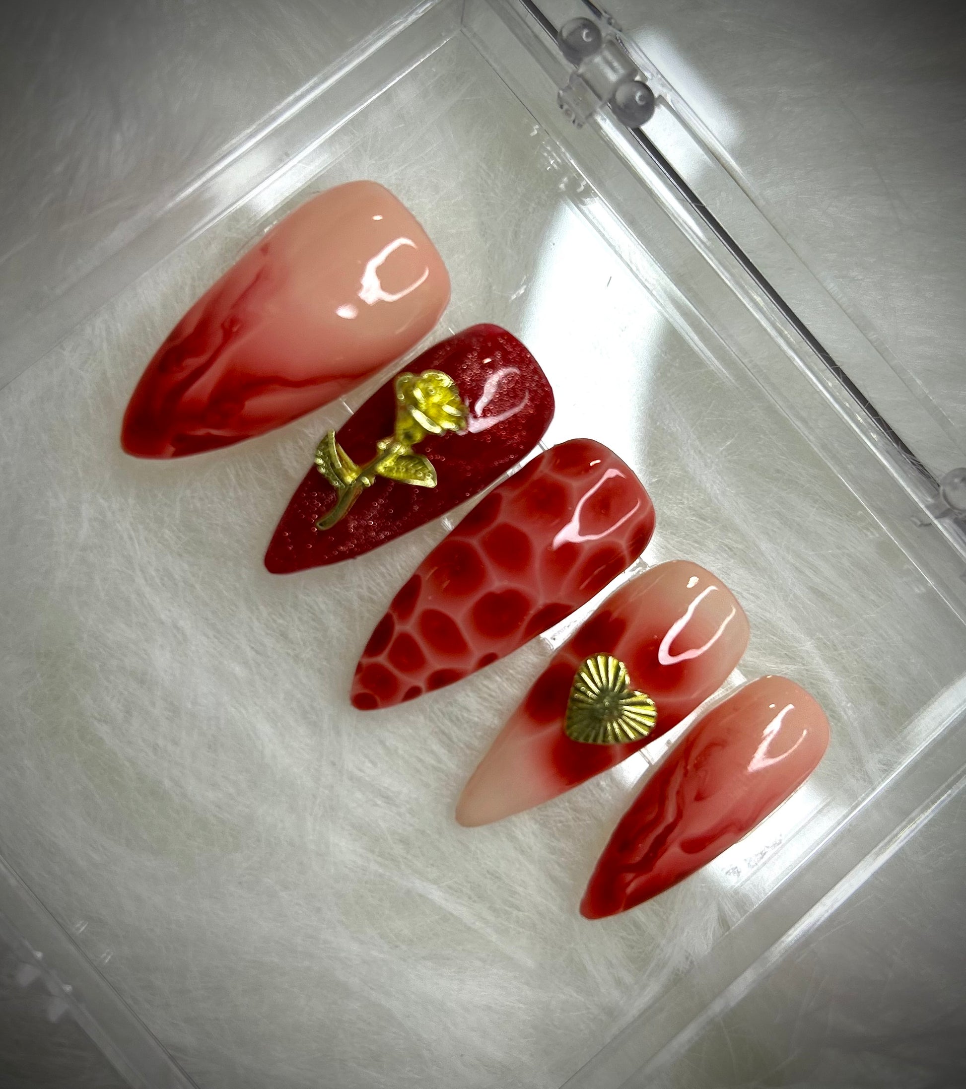 Unleash your dark romance with our press-on nail set in style Teresa! This hauntingly beautiful design blends deep red hues with an eerie, bloody effect—perfect for alternative and gothic aesthetics. Featuring a mix of realistic blood drips, reptilian textures, and gold embellishments, this set is both elegant and edgy.