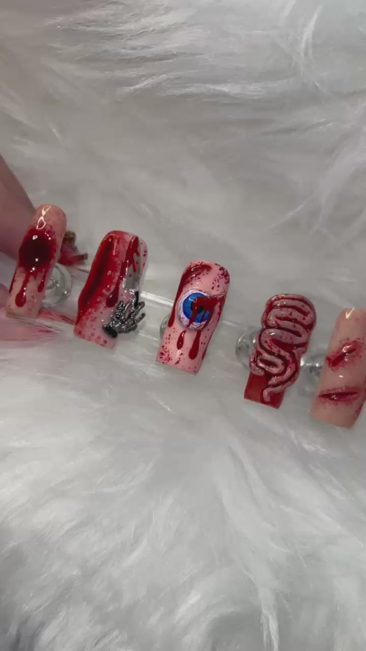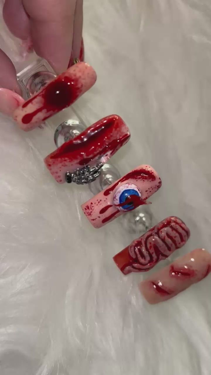 Step into the realm of pure horror with Torturess, a nail set straight out of your bloodiest nightmares. Dripping with gore and crafted for the fearless, each nail tells a gruesome story of torment and terror. From hyper-realistic blood splatters to a dangling, lifelike eyeball, razor-sharp gashes, and even exposed intestines—this set is not for the faint of heart.